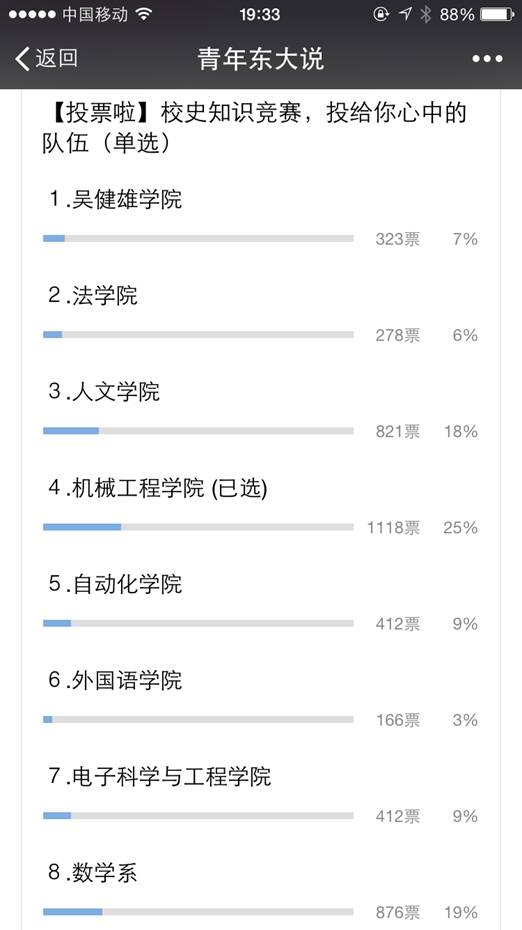 经过9月份校史校情知识竞赛初赛的筛选过后,有8个院系从中脱颖而出进入到了2015年东南大学校史知识竞赛决赛。他们分别是:机械工程学院,电子科学与工程学院,数学系,自动化学院,人文学院,外国语学院,法学院,吴健雄学院。