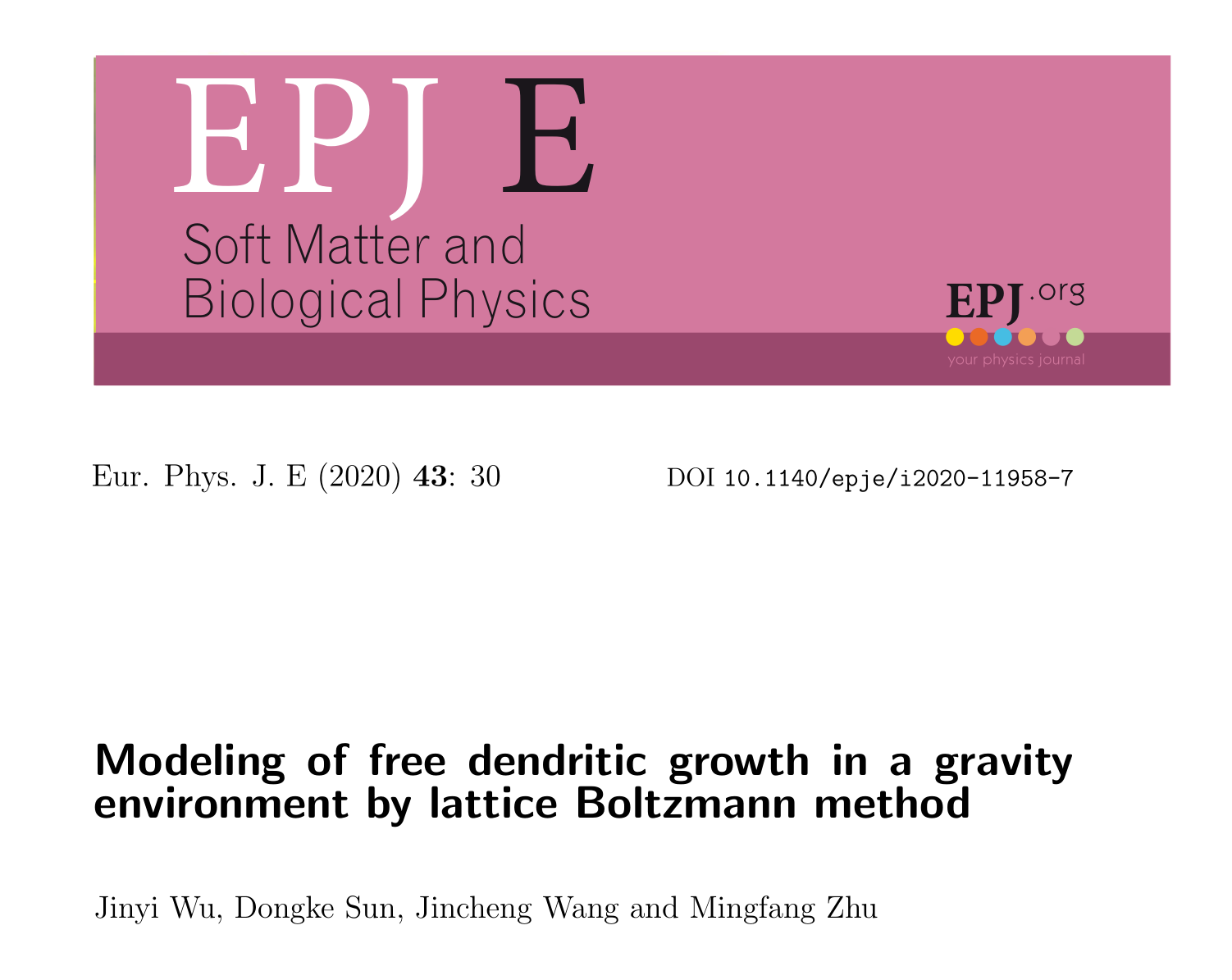 近日,我院2017级本科生吴津仪同学以第一作者在国际著名出版集团斯普林格旗下的老牌国际期刊《European Physical Journal E》发表论文(该期刊为物理领域JCR分区二区期刊)。这是我院近年来大学三年级本科生发表的第一篇国际期刊论文。论文以“Modeling of Free Dendritic Growth in a Gravity Environment by Lattice Boltzmann Method”为题,重点阐述了重力作用下枝晶生长的数值建模与模拟方法。