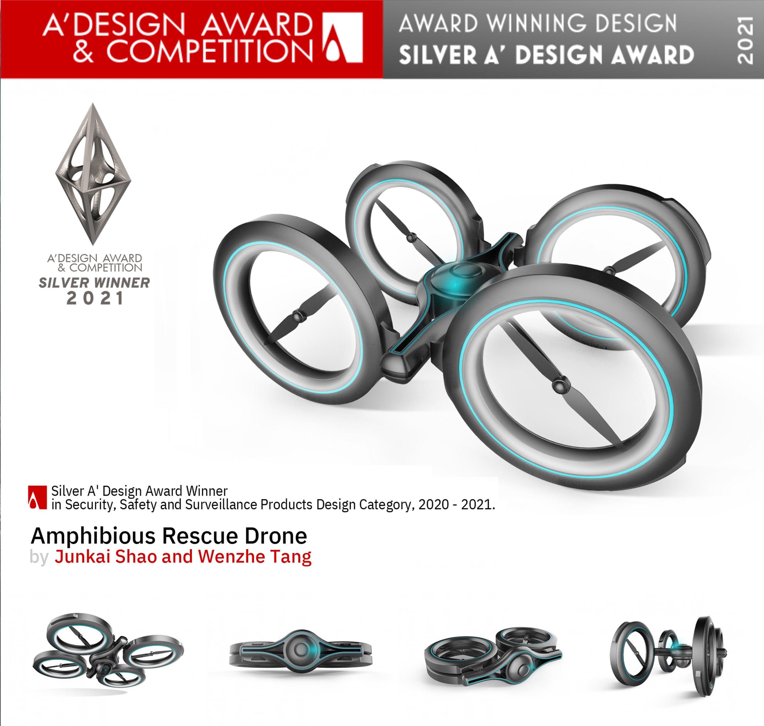 近日,全球设计界备受瞩目的A' Design Award 2021设计大奖揭晓,由MK平台工业设计专业17级博士生邵俊凯、18级博士汤文哲设计,薛澄岐教授指导的作品“Amphibious Rescue Drone”,从全球108个国家和地区的20000多份参赛作品中脱颖而出,经过211位具有国际影响力的知名学者、著名媒体成员、创意设计专业人士和有丰富经验的企业家组成的评审团严格评审,斩获“2021 A' Design Award银奖”。