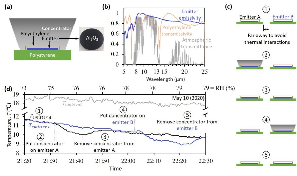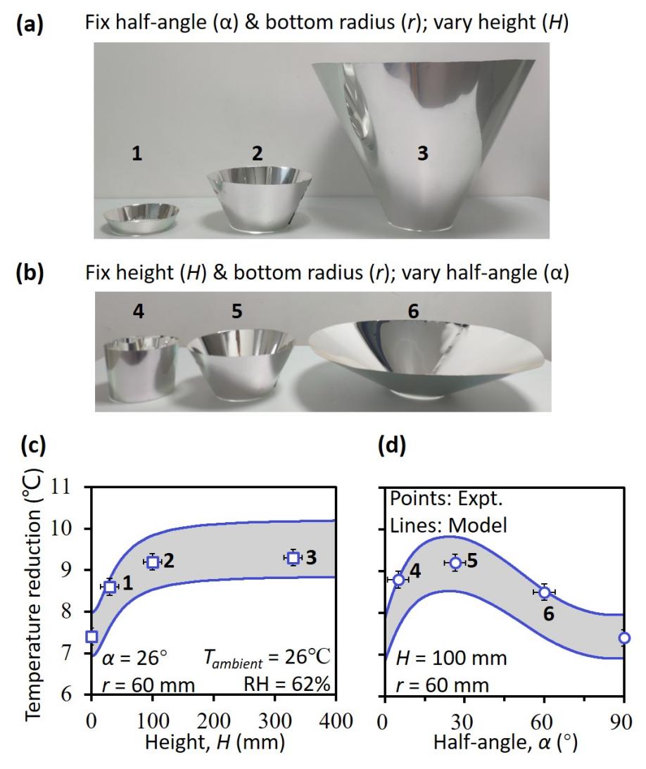 图3:(a-b)根据理论优化的辐射制冷“汇聚器”(c-d)实验结果与理论模型对比。