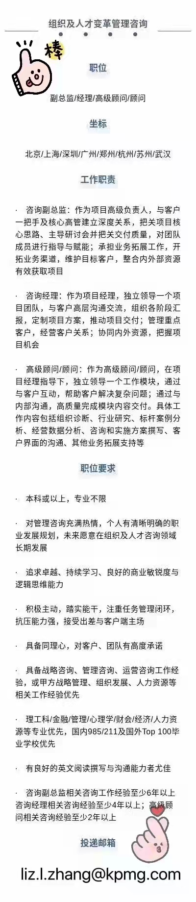 毕马威企业咨询(中国)有限公司连续四年荣腐中国杰出雇主,每一位优秀的毕马威人汇聚成了毕马威这个充满活力和潜力的 Top Employer,在崭新的2022年里,毕马威期待您的加入,让我们一起携手创造非凡、成就未来!