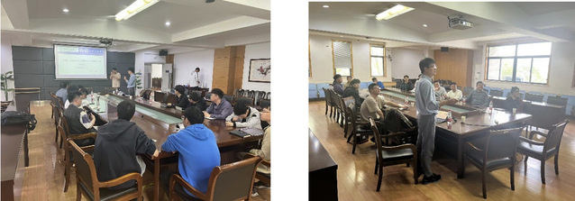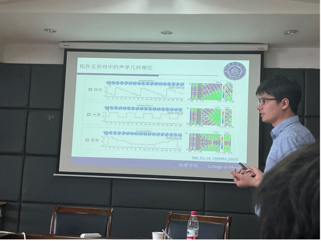 讲解环节结束后,与会师生们积极与伏教授进行互动并提问。伏教授细致地与师生们交流了关于相位梯度声学超构表面的相位调控,非对称传输原理等问题,强调了非厄米、几何相位等概念与人工梯度微结构的结合,有望促进声学超构表面的发展。
