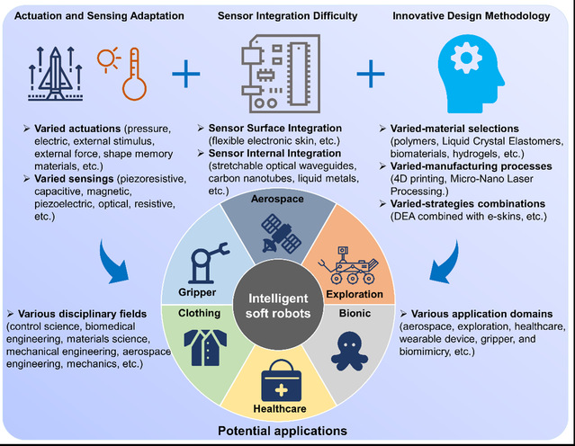该研究认为软体机器人的未来发展在于驱动与传感的完美结合,例如通过柔性电子皮肤在软体机器人的表面集成传感器,或将传感器内部嵌入驱动器等集成方法。该研究同时强调了驱动和传感的平衡是软体机器人实现智能化的关键,选择合适的驱动和传感策略应根据应用场景的具体需求,例如在狭小空间内移动或需要更大驱动力的场合。
