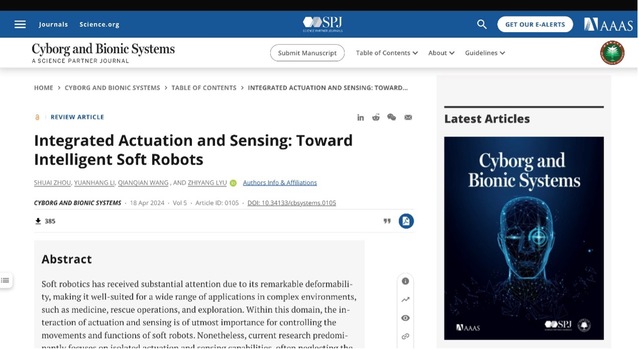 近日,我院2020级本科生周帅和李远航在软体机器人研究方向取得进展,相关研究成果以“Integrated Actuation and Sensing: Toward Intelligent Soft Robots”为题发表在中国科技期刊卓越行动计划高起点期刊、Science partner Journal机器人与生命系统交叉领域期刊《Cyborg and Bionic Systems》。