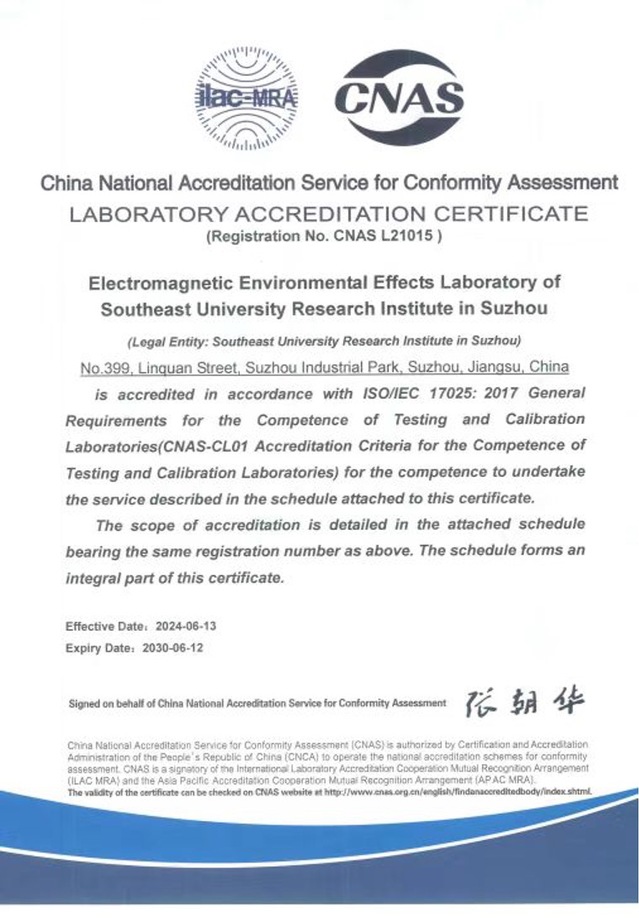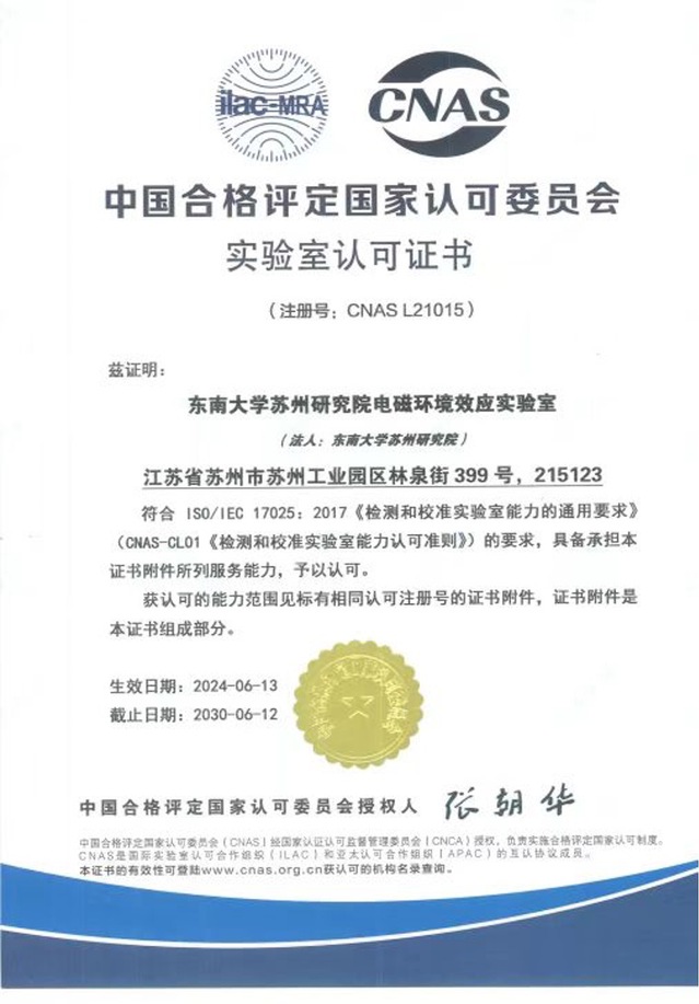 近日,东南大学苏州研究院电磁环境效应实验室成功获得中国合格评定国家认可委员会(CNAS)认可。CNAS评审组专家对实验室进行了全面的现场检查和评审。现场评审覆盖了CNAS认可准则的全部要素,涵盖了实验室申请认可的全部技术能力。