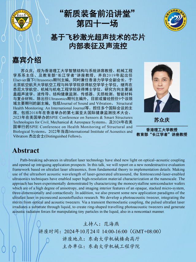 苏众庆,现为香港理工大学智慧结构与系统讲席教授、机械工程学系系主任、及教育部“长江学者”讲座教授,并自2019年起出任Elsevier旗下Ultrasonics期刊主编,同时兼任香港力学学会副会长。于北京航空航天大学航空工程与科学学院获得航空学学士学位,继而在悉尼大学航空、机械与机电工程学院获得博士学位。研究方向主要涵盖超声波学、波传导、结构健康监测、传感器、无损检测、智能材料与复合材料。除出任Ultrasonics期刊主编外,目前或曾经担任9个该领域主要期刊的副主编,包括Journal of Sound and Vibration、 Structural Health Monitoring: An International Journal等。担任多个国际会议的主席,包括2018年在香港举办的第七届亚太国际健康监测技术大会、2023年在美国举办的SPIE Conference on Sensors & Smart Structures Technologies for Civil, Mechanical & Aerospace Systems、及2024年在美国举行的SPIE Conference on Health Monitoring of Structural and Biological Systems。2022年当选International Institute of Acoustics and Vibration 杰出会士(Distinguished Fellow)。