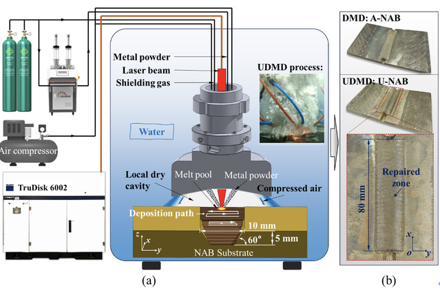 因此,有必要研究NAB合金在水下原位修复过程中水冷条件下各种κ相的显微组织演化特征,以及NAB构件在后续热处理无法进行的条件下的修复性能。研究团队采用水下激光金属沉积技术(Underwater direct metal deposition, UDMD)在水下环境(30 m压力)原位修复镍铝青铜构件。这项研究表明,完全水冷的环境可以为铜合金、还为合金制造过程中的微观结构控制提供新的工艺参考。
