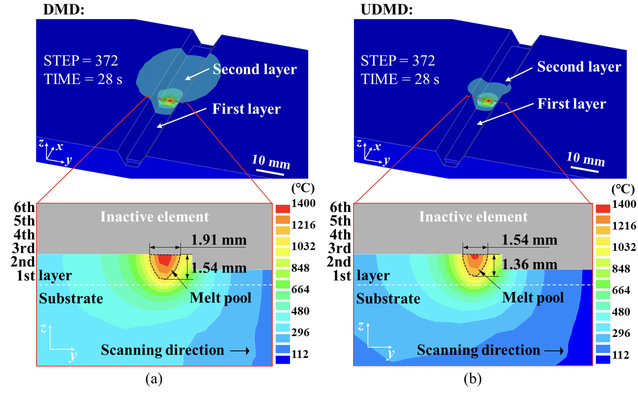 图1 修复过程中28秒时的温度场分布和熔池尺寸。 (a) 陆上维修过程(DMD),(b) 水下修复过程(UDMD)