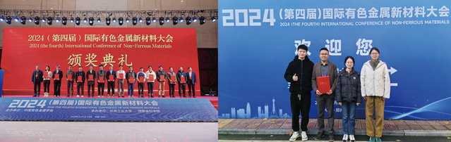 2024年11月22日-24日,第四届国际有色金属新材料大会(ICNFM)在中国郑重顺利召开。我院2020级博士研究生毛士麟同学荣获“新材料优秀青年奖”和“ICNFM优秀论文奖”。