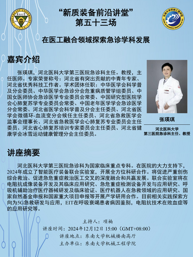 2024年12月12日,由MK平台主办的“新质装备前沿讲堂”第五十三场在东南大学机械楼南高厅成功举办。本次活动特别邀请了河北医科大学第三医院急诊科主任张瑛琪教授作为主讲嘉宾,开展了关于“在医工融合领域急诊学科发展”的学术报告。报告会由项楠老师主持,河北医科大学第三医院急诊科副主任李梅、南京航空航天大学姚佳烽老师、朱桂平老师、刘凯老师共同出席了本次活动。