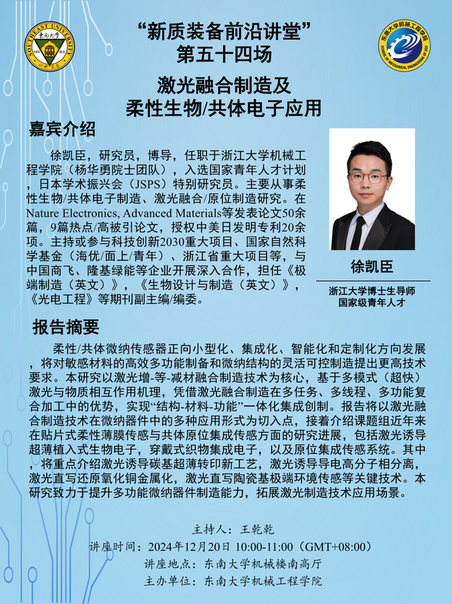 徐凯臣,研究员,博导,任职于浙江大学机械工程学院(杨华勇院士团队),入选国家青年人才计划,日本学术振兴会(JSPS)特别研究员。主要从事柔性生物/共体电子制造、激光融合/原位制造研究。在Nature Electronics, Advanced Materials等发表论文50余篇,9篇热点/高被引论文,授权中美日发明专利20余项。主持或参与科技创新2030重大项目、国家自然科学基金(海优/面上/青年)、浙江省重大项目等,与中国商飞、隆基绿能等企业开展深入合作,担任《极端制造(英文)》,《生物设计与制造(英文)》,《光电工程》等期刊副主编/编委。