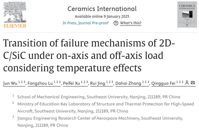近日,航空航天系费庆国教授团队在陶瓷基复合材料高温强度研究领域取得重要进展,相关成果以“Transition of failure mechanism of 2D-C/SiC under on-axis and off-axis load considering temperature effects”为题在陶瓷研究领域TOP期刊《Ceramics International》上发表。