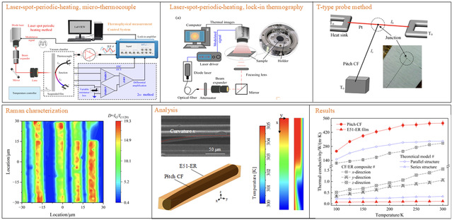 为此,课题组开发了T形探针法、2ω法及激光周期加热法(图1),与清华大学、浙江大学等单位合作,成功实现了从单根碳纤维、树脂基体薄膜到高取向复合材料的热导率、热扩散率与体积比热容的准确表征,并结合有限元模拟分析了微观纤维弯曲对热流的影响,相关成果发表于《Carbon》(IF:10.5)等期刊。该研究完整测量了高取向碳纤维复合材料三个主轴方向的热物性,并深入探讨了复合材料及其各组分热性能之间的内在联系,为高密度电子器件的定向散热与热管理解决方案提供了重要的依据。