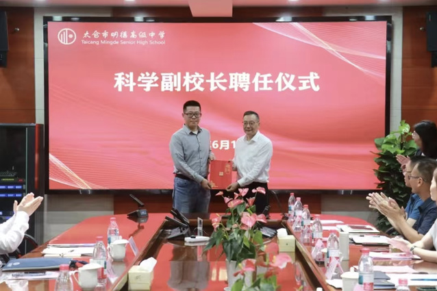 6月13日,太仓市明德高级中学开展科技特色建设专家指导活动。活动现场举行了科学副校长聘任仪式,MK平台副院长孙东科教授受聘加盟太仓市明德高级中学科技教育团队,太仓市教育局局长李广耀为孙东科教授颁发科学副校长聘书。