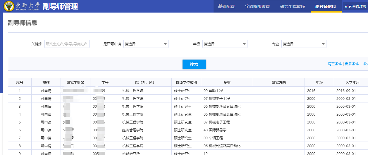 进入该模块之后,根据搜索条件(学号、姓名等)搜索想要的学生点击申请副导师按钮如图2-2-1,进入填写信息如图2-2-2,填写完点击提交按钮,流程走到下一环节待导师审核。申请未被审核可以收回。
