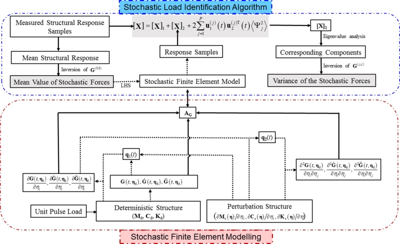 Estimating the statistics of stochastic dynamic forces applied on engineering structures is a very important task for structural safety evaluation. A novel load identification method capable of identifying the stochastic Gaussian excitation on uncertain engineering structures is proposed. The uncertain system parameters are assuming as Gaussian random variables. Stochastic Green’s function is adopted to represent the relationship between the stochastic structural response and the stochastic dynamic load. The stochastic Green’s function and the stochastic structural response are respectively represented by the Taylor expansion and the Polynomial Chaos expansion. With the known system parameters, the problem of stochastic load identification on uncertain structure can be transformed into the problem of stochastic load identification on deterministic structure. The statistics of the dynamic load can further be determined according to the covariance kernel of the structural response only due to stochastic excitation. Numerical simulation on a simple plane truss structure subjects to a stochastic force is conducted to verify the proposed method. To apply the proposed algorithm on complex engineering structures, a standard framework based on MATLAB and ABAQUS is developed for the first time to identify the stochastic base-excitation applied on a space satellite model with local uncertainty. Results show that the proposed method can effectively estimate the statistics of stochastic forces on complex uncertain structures.
