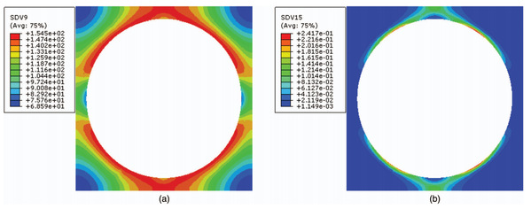 Fig. (Color) (a) Equivalent stress; and (b) inelastic strain along loading direction distribution in the model at a low strain rate with εyy = 2.37%.