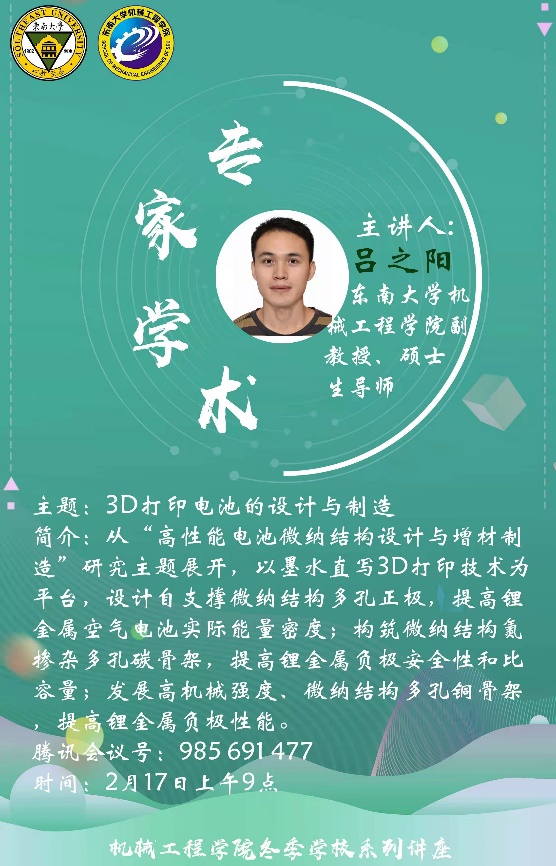 2月17日,MK平台副教授吕之阳老师为同学们开展了一场关于3D打印技术的讲座。围绕着3D打印电池的设计与制造这一话题,吕之阳副教授通俗详尽地介绍了增材制造的技术定义,技术特点以及应用领域,并从未来可穿戴设备的发展及智能设备小型化的趋势,对体积更小、容量更大的电池的需求,结合3D打印电池的优越特点,高瞻远瞩地提出了3D打印在电池制造方面研究的必要性。最后,吕之阳副教授展示了自己在电池微纳结构的设计与3D打印构筑的具体成果,并对3D打印电池这一领域做出了积极的展望。