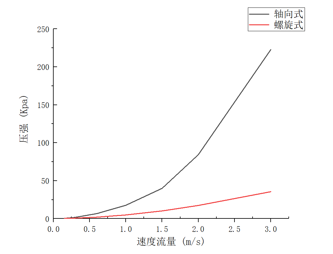 - 两种水道对比我们可以发现在同种流速下,轴向式水道的进出口压力平均值要高于螺旋式水道,并且螺旋式水道随着入口流速增加而增加的趋势比较缓;