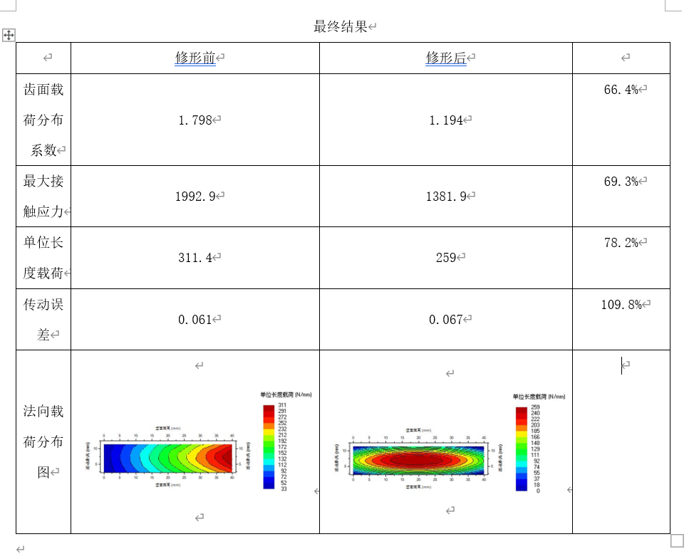 - 利用KISSsys软件得出的配齿参数,在Romax软件里建立模型并进行仿真,修形前后齿面载荷分布系数、最大接触应力、单位载荷长度、法向载荷分布均得到改善,传动误差略有增加但修形后数据在合理范围内;