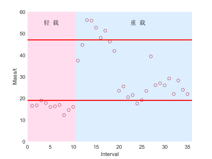 注:红线分别代表卡车轻重载时的载重,散点代表不同时段的载重估计结果