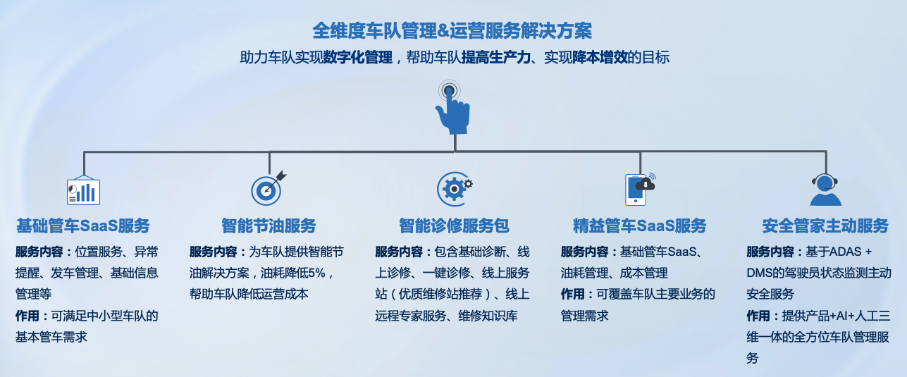 2)制定了营销转型的解决方案,包含数字化平台、后市场生态产品和客户运营服务,为终端提供车载生态,为B端提供数字化管理方案和金融衍生服务,帮助车队提高生产力,实现降本增效的目标。