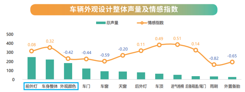 根据《中国汽车潮流观察报告》,在汽车外观方面,用户对外观颜色、前,后外灯、车窗以及车门设计等方面情感指数偏低,需要中国品牌在外观细节设计方面多下功夫。