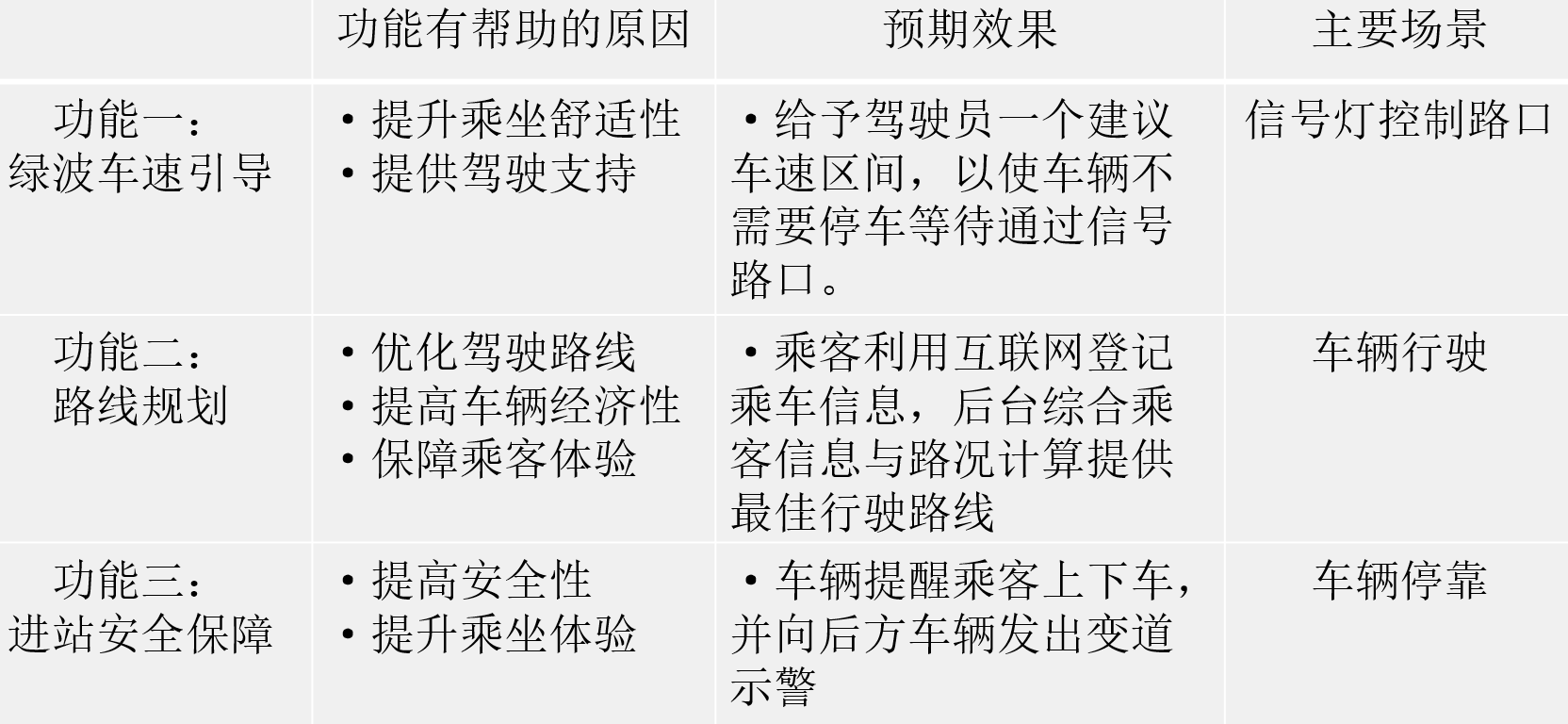 使用需求:行驶安全、节省时间、身份验证、座位管理、路线规划、车辆安排
