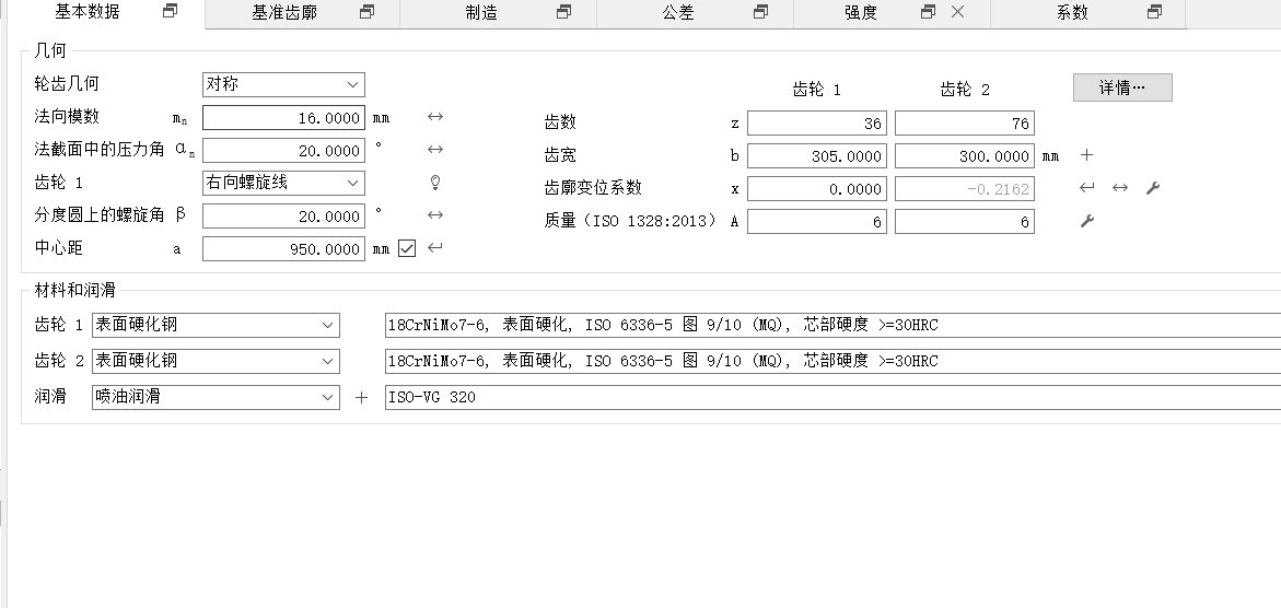齿轮件设计要求:采用18CrNiMo7-6材料,斜齿圆柱齿轮,齿轮表面渗碳淬火,强度计算依据ISO6336/GB3480,齿面接触疲劳极限σHlim=1500N/mm2,齿根弯曲疲劳极限σFlim=500N/mm2,Ka=1.3,KHβ=1.25,KHα=1.0,Kv=1.05,齿面粗糙度Ra=0.6,齿根粗糙度Rz=20,总重合度εγ>2.0,压力角αn=20°,齿轮精度达到ISO1328标准的5级精度,齿轮疲劳强度安全系数SH≥1.25,SF≥1.56,齿轮静强度安全系数SH0≥1.0,SF0≥1.4。